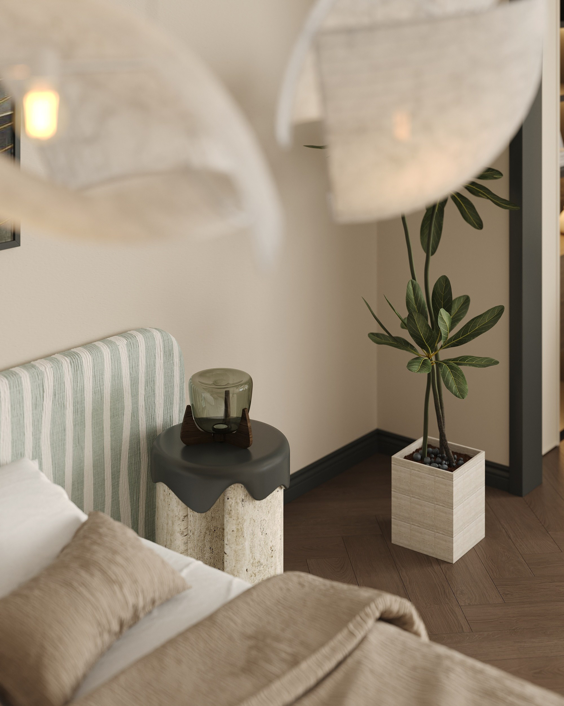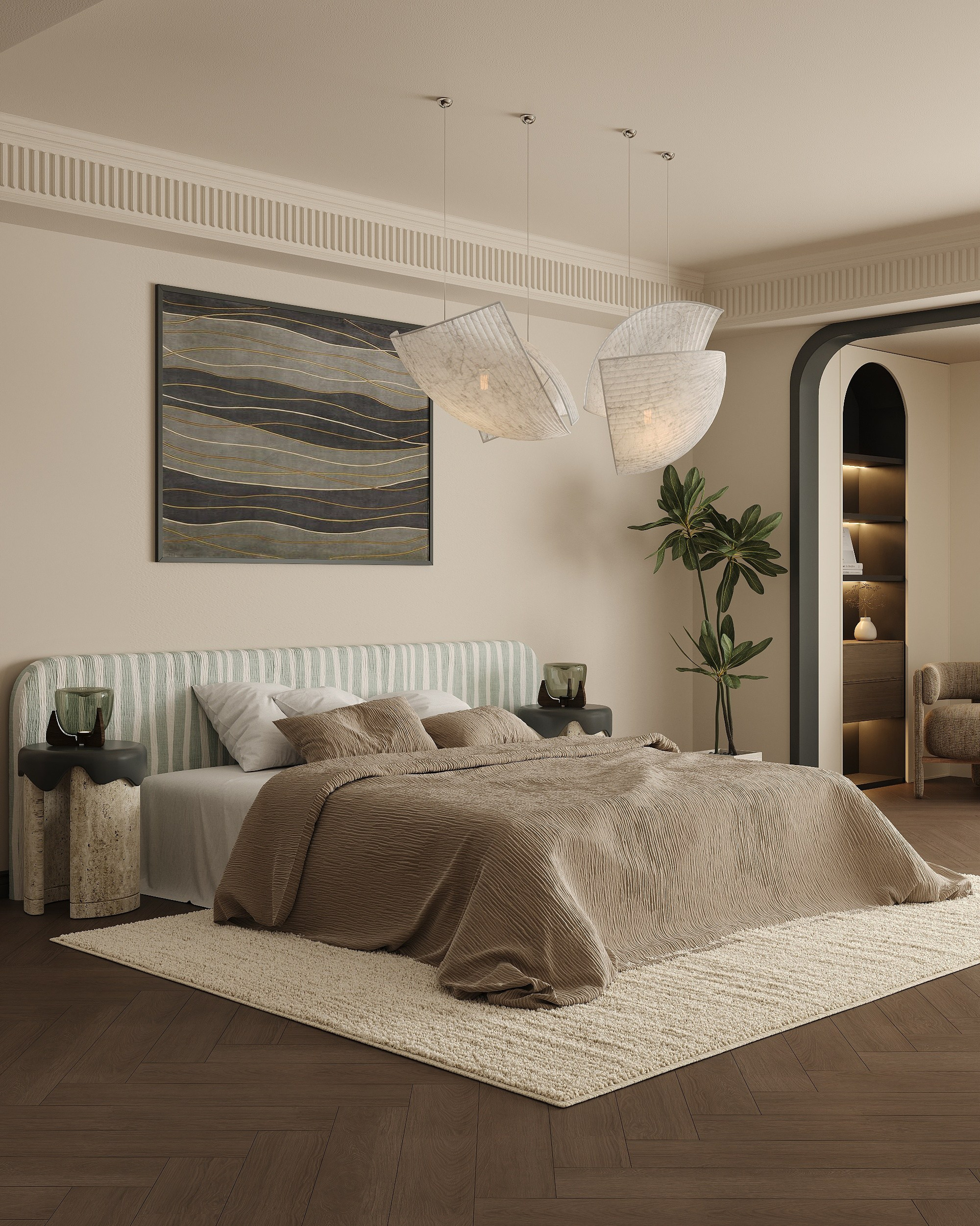 Bedroom interior in the spirit of neoclassicism and minimalism